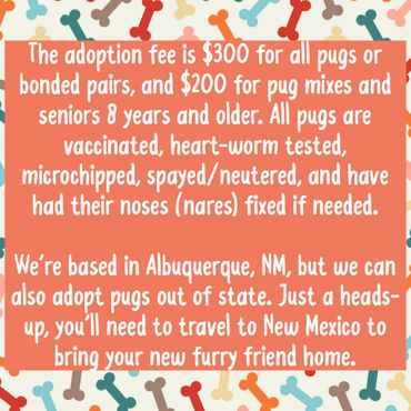 We will adopt out of state, however you must travel here to adopt. We have a standard $300 adoption fee and all pugs adopted are spay/neutered, vaccinated, heart-worm tested, and microchipped. We rescue pugs of all ages find their happy furever homes. We have a pug community on our Facebook Page that you can follow.